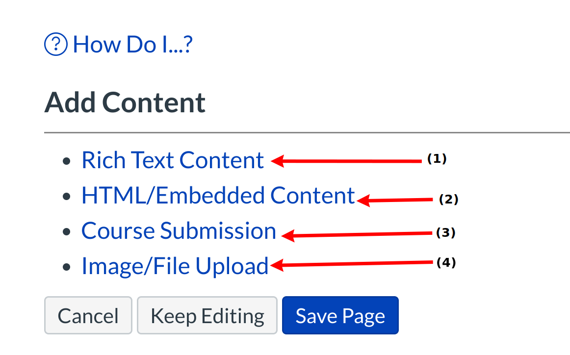 You can add Rich Text Content, HTML/Embedded Content, Course Submissions, or Image/File Uploads.