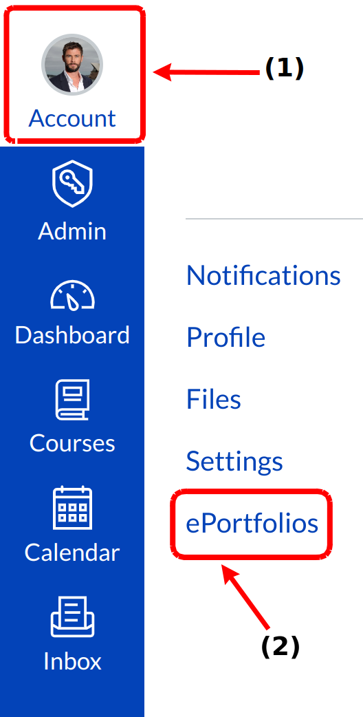 Click the Account menu [1] and select the ePortfolio link [2]. Student ePortfolios remain active as long as the student is in the institution’s SIS and maintains a school log-in, they will have access to their ePortfolio even after they graduate. Sublime LMS ™ also offers the opportunity for the students to download their ePortfolio to a zip file.