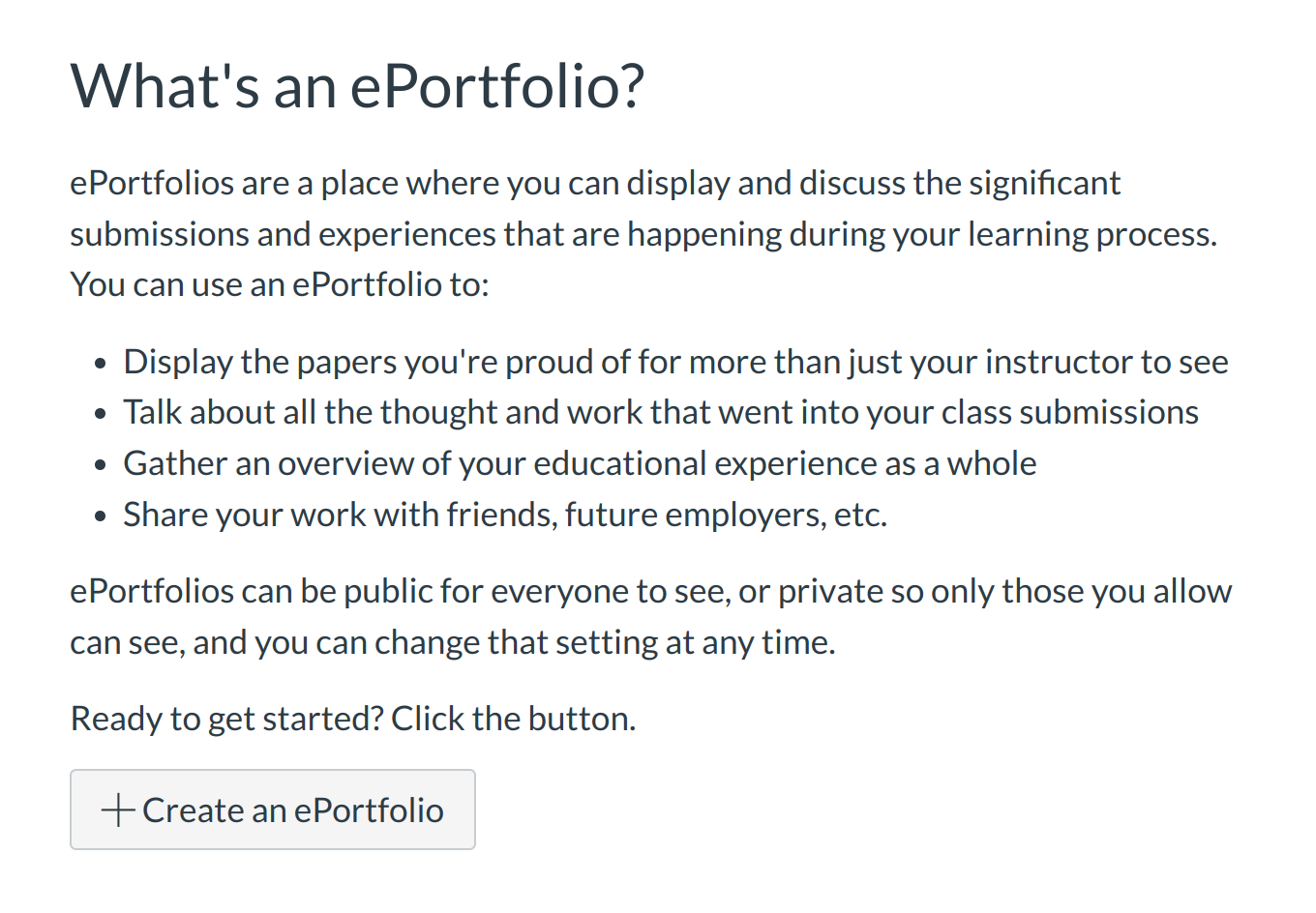 ePortfolios can be public for everyone to see, or private so only those you allow can see, and you can change that setting at any time.