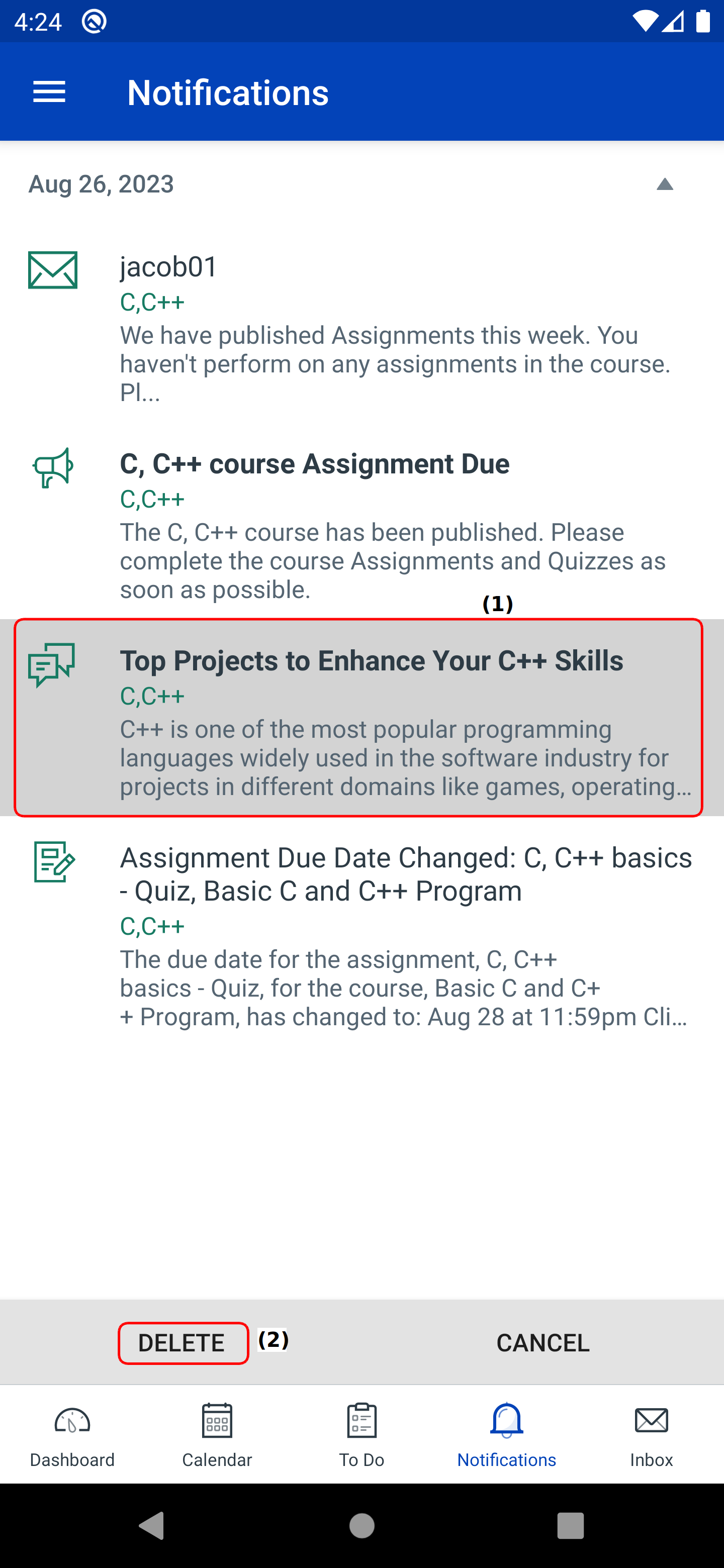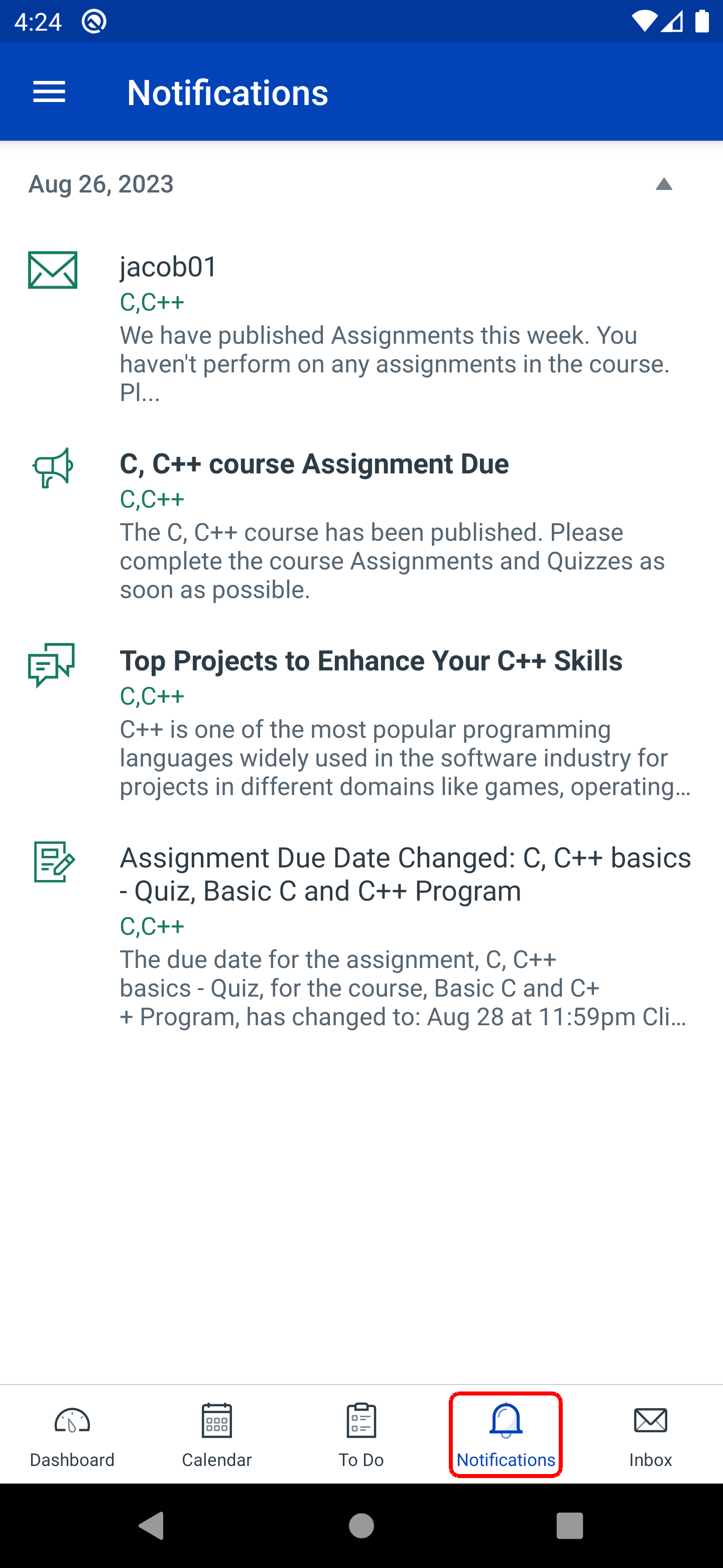 Notifications display the changes to an assignment due date, newly created assignment, course announcement or a reply to a subscribed discussion.