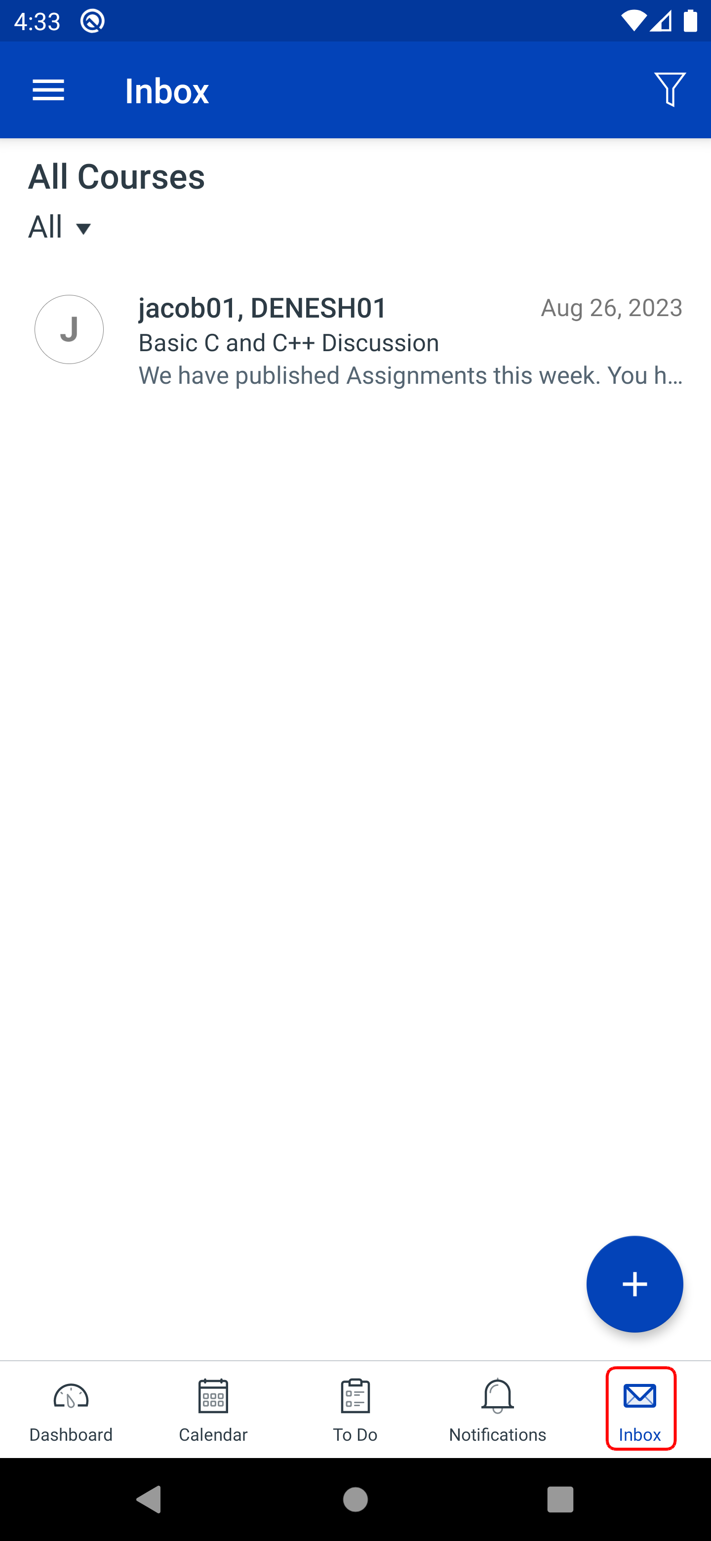 The application displays To-Do items, Notifications and Messages, along with the functionality to access and complete a course.