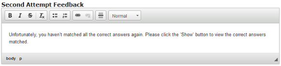 Second Attempt Feedback is the feedback that appears when the user selects a wrong answer at the second attempt. Type the contents in the Second Attempt Feedback field as shown in the above image.