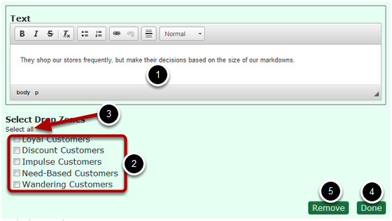 Now you can see all the drop zones have been selected. The Select all link is now changed to Deselect all. If you click this link, the answers will be deselected. We leave all the drop zones selected for our task. Then click on the Done [4] button to save the changes. You can also remove this draggable answer box by clicking the Remove [5] button. You will see the below screen.