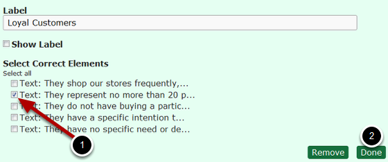 Once you've shuffled the answers, you can set which answers should match the questions in boxes. To do that, double click the first drop zone. You will see the above screen again. Check the checkbox with the correct answer [1] for the first question. Then click the Done [2] button.