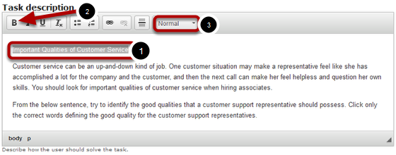 Similarly, you can format the contents of description and feedback fields using six Formatting [1] buttons shown above. The formatting options available are: