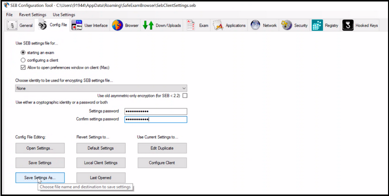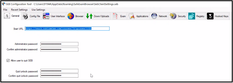 13. Once you have all these set up, you can save as in your preparable location and close the SEB and send the SEB setting file with settings password & Quit/unlock password to every student to take the quiz/exam through SEB browser.