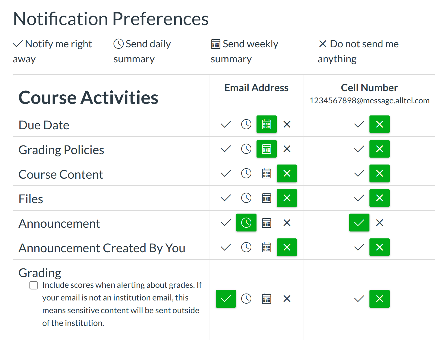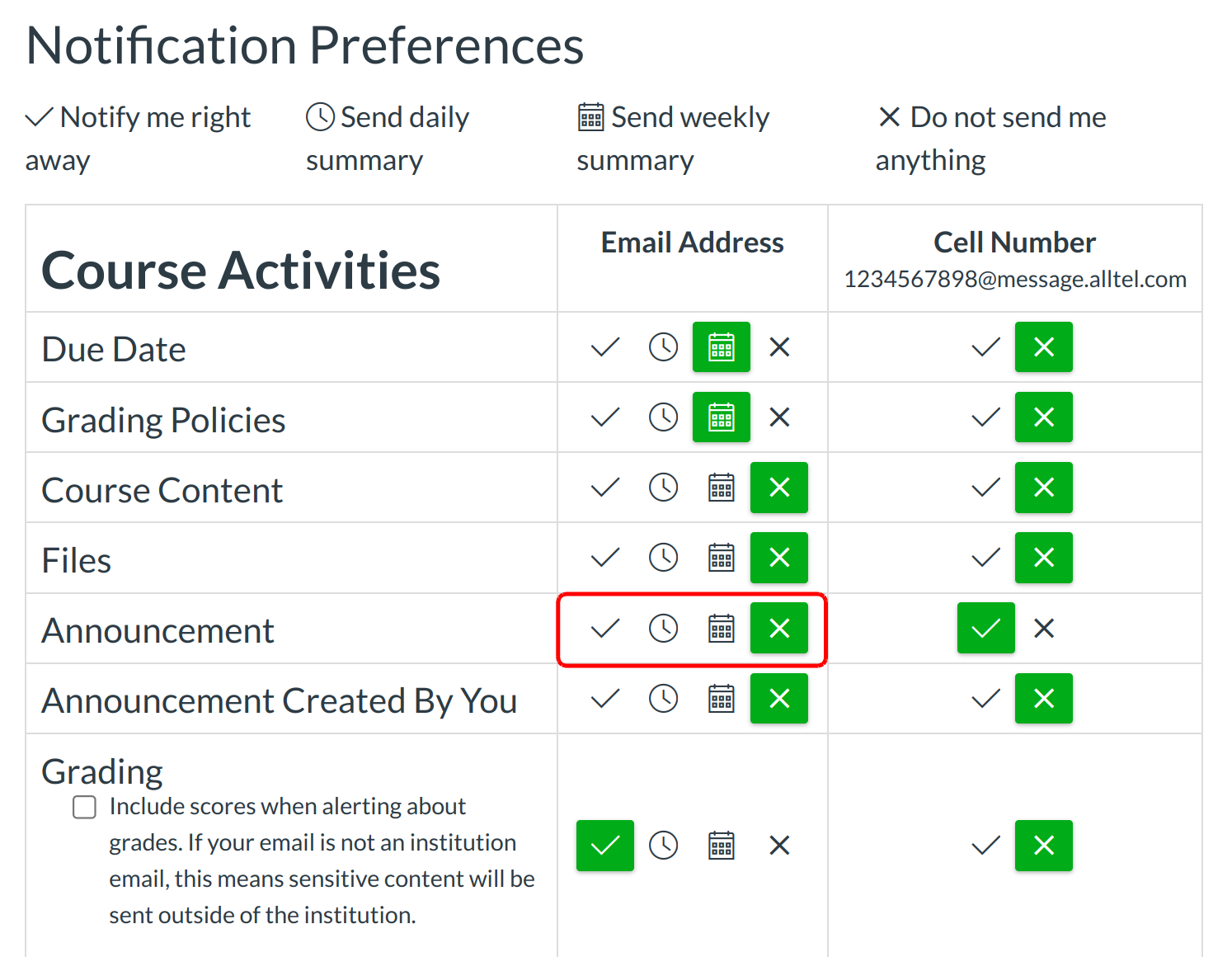 Hover over the Announcement cell under the Email Address column. Set the notification preference by clicking on the appropriate icon.