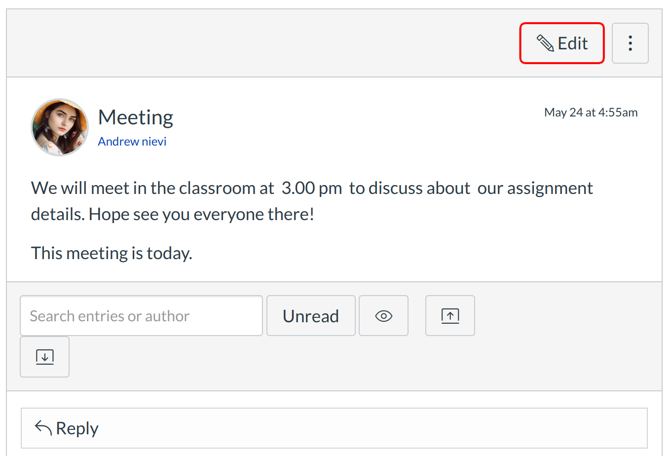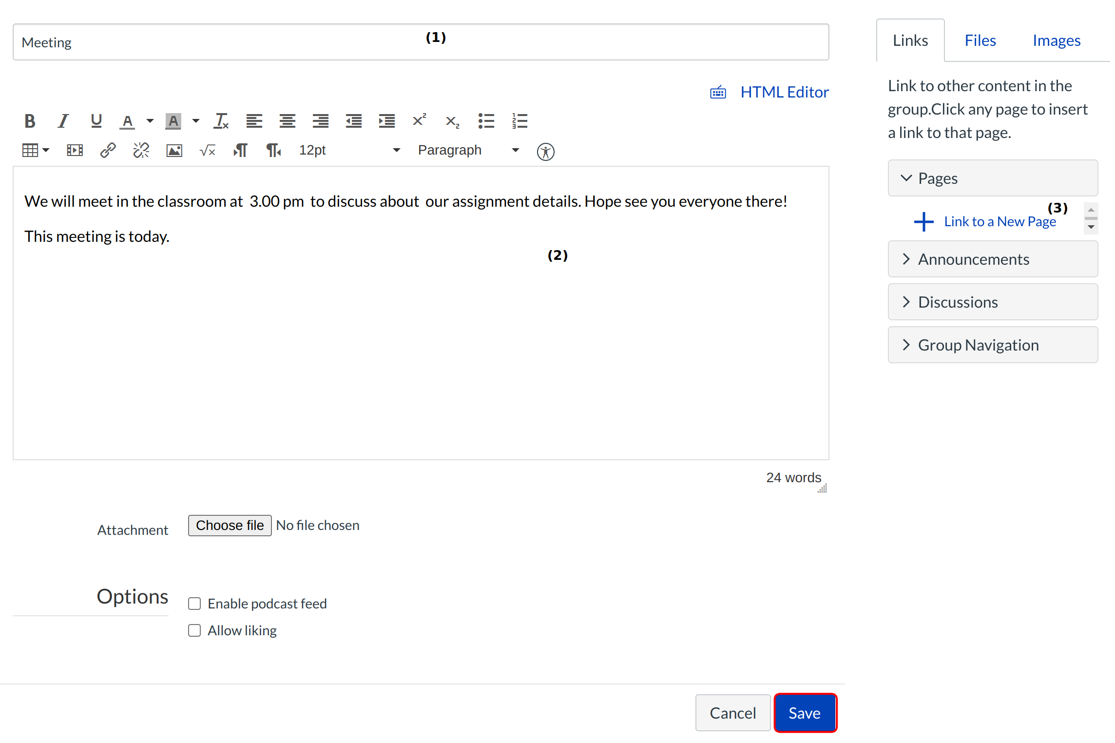 Edit the Announcement. You can can edit the title [1], write a different message [2], add content [3], and when you are finished editing, click the Save button.
