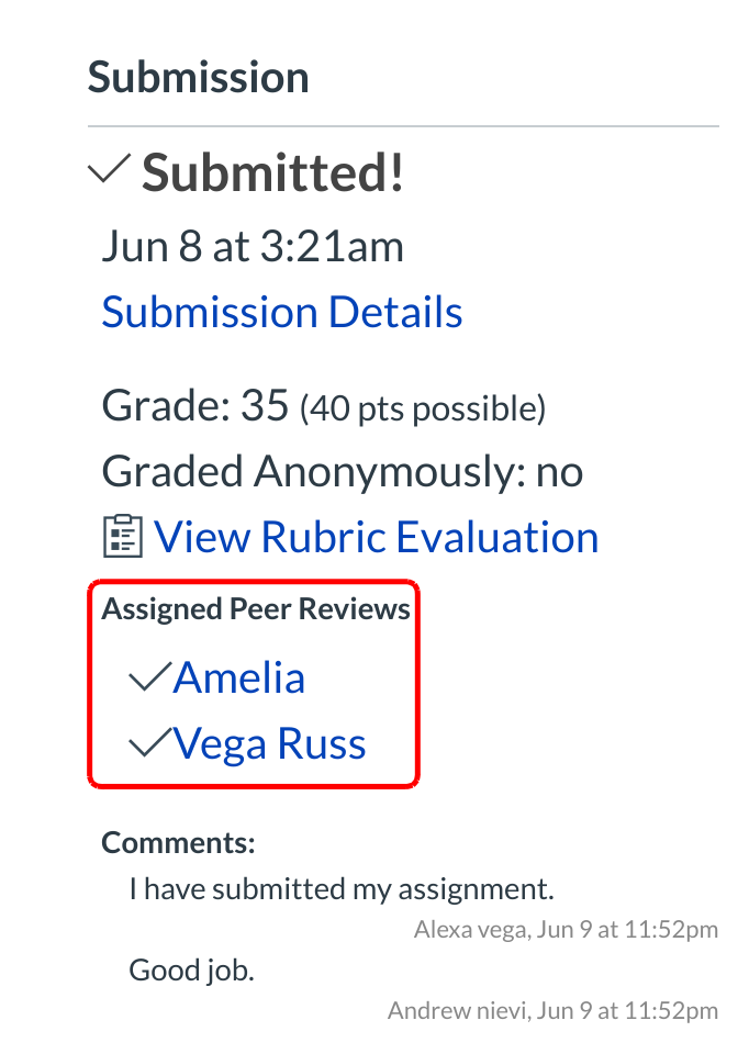 Note: When completing a peer review, students cannot see the teacher's comments or their peer's comments on the submission.