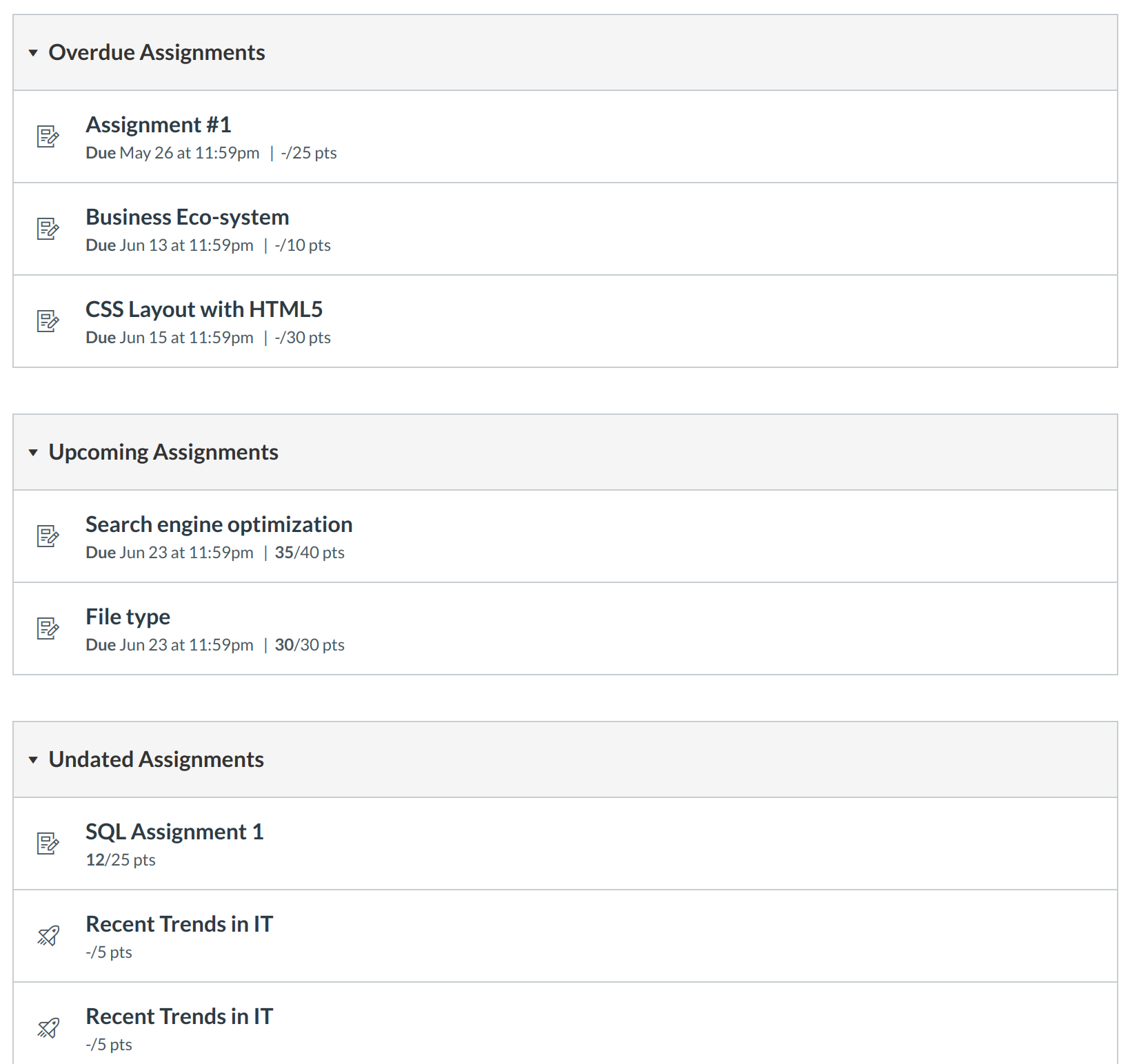 Assignments include Quizzes, graded Discussions, and online submissions (i.e. files, images, text, URLs, etc.)
