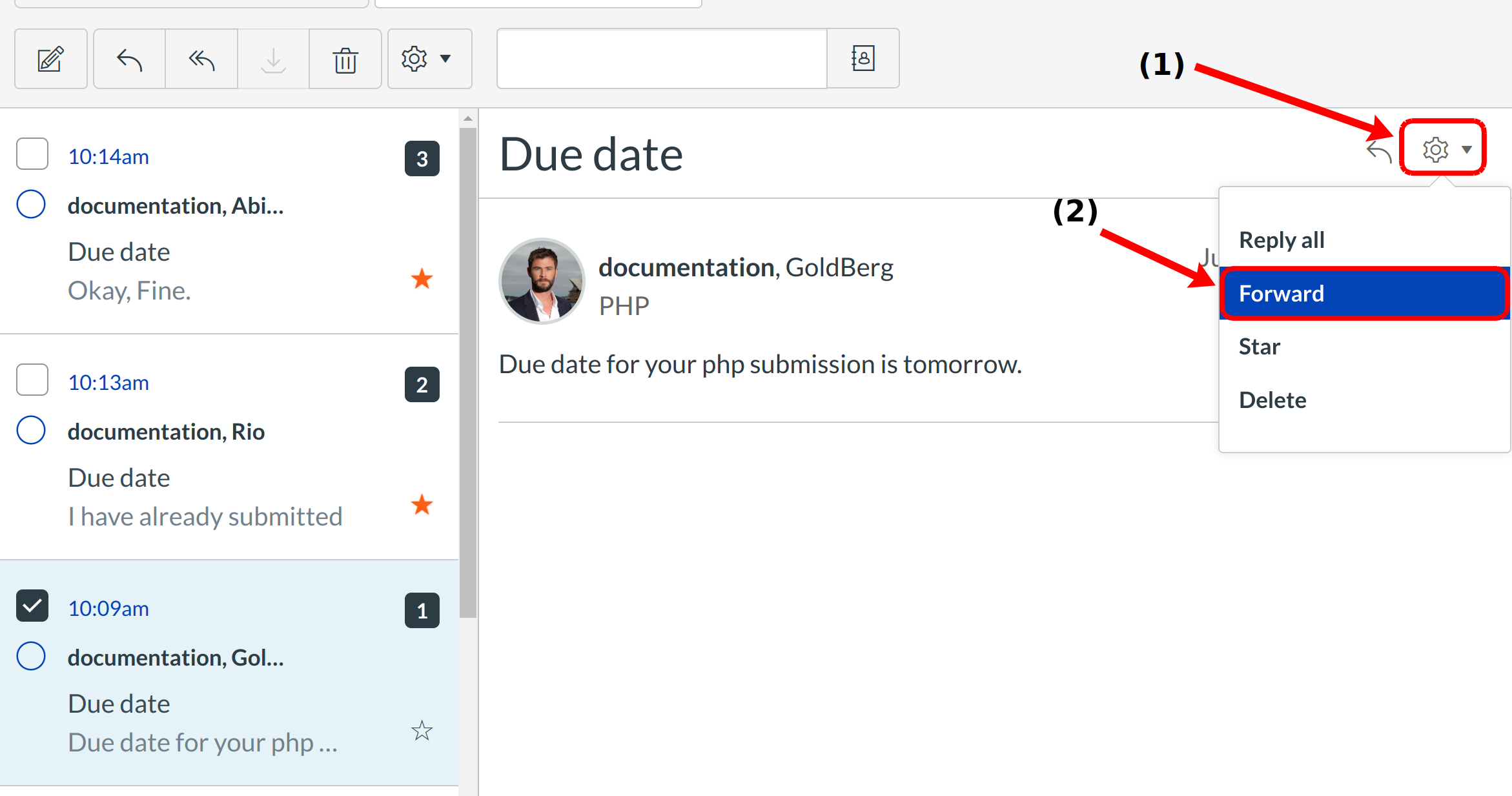 Hover over the the settings icon to view more options [1]. Select the Forward option [2].