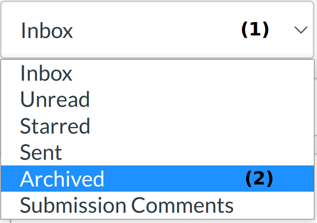 Click the Inbox drop-down menu [1]. Select the Archived link to open archived Conversations [2].