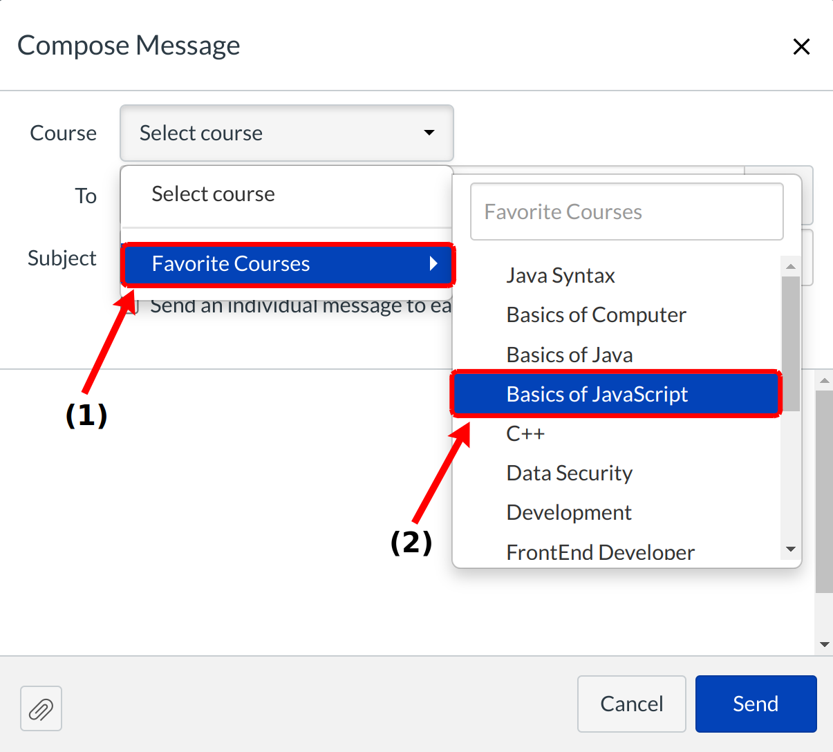 In the Courses drop-down menu, select the course where you want to send your message. You can filter your courses by current favorite courses [1], and concluded courses [2].