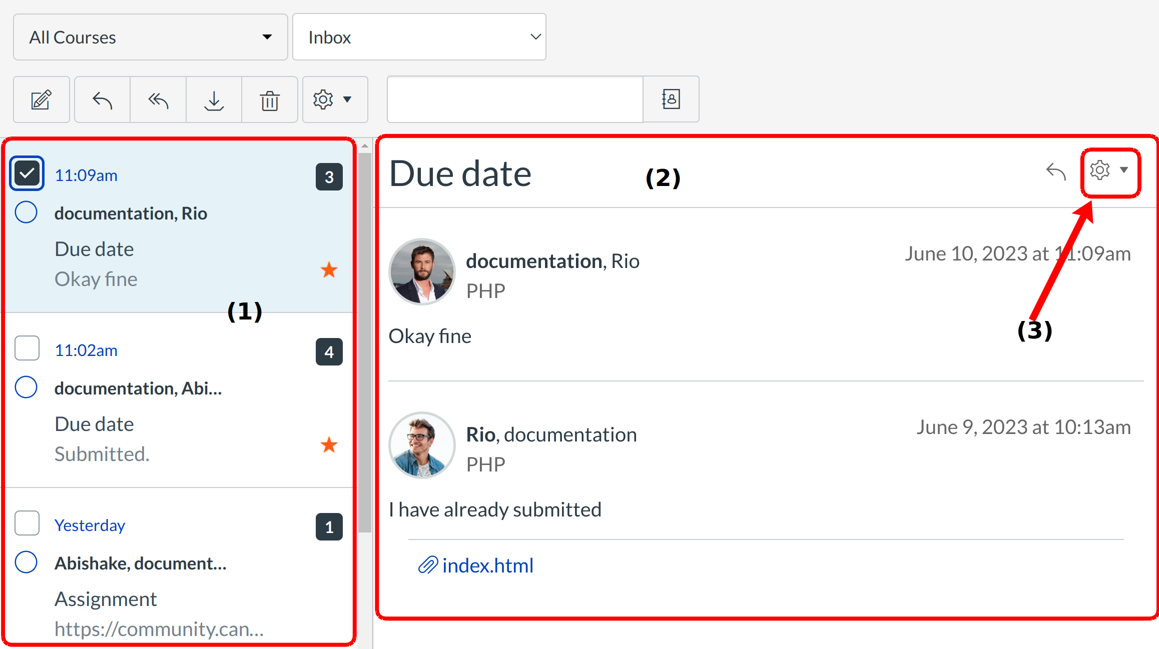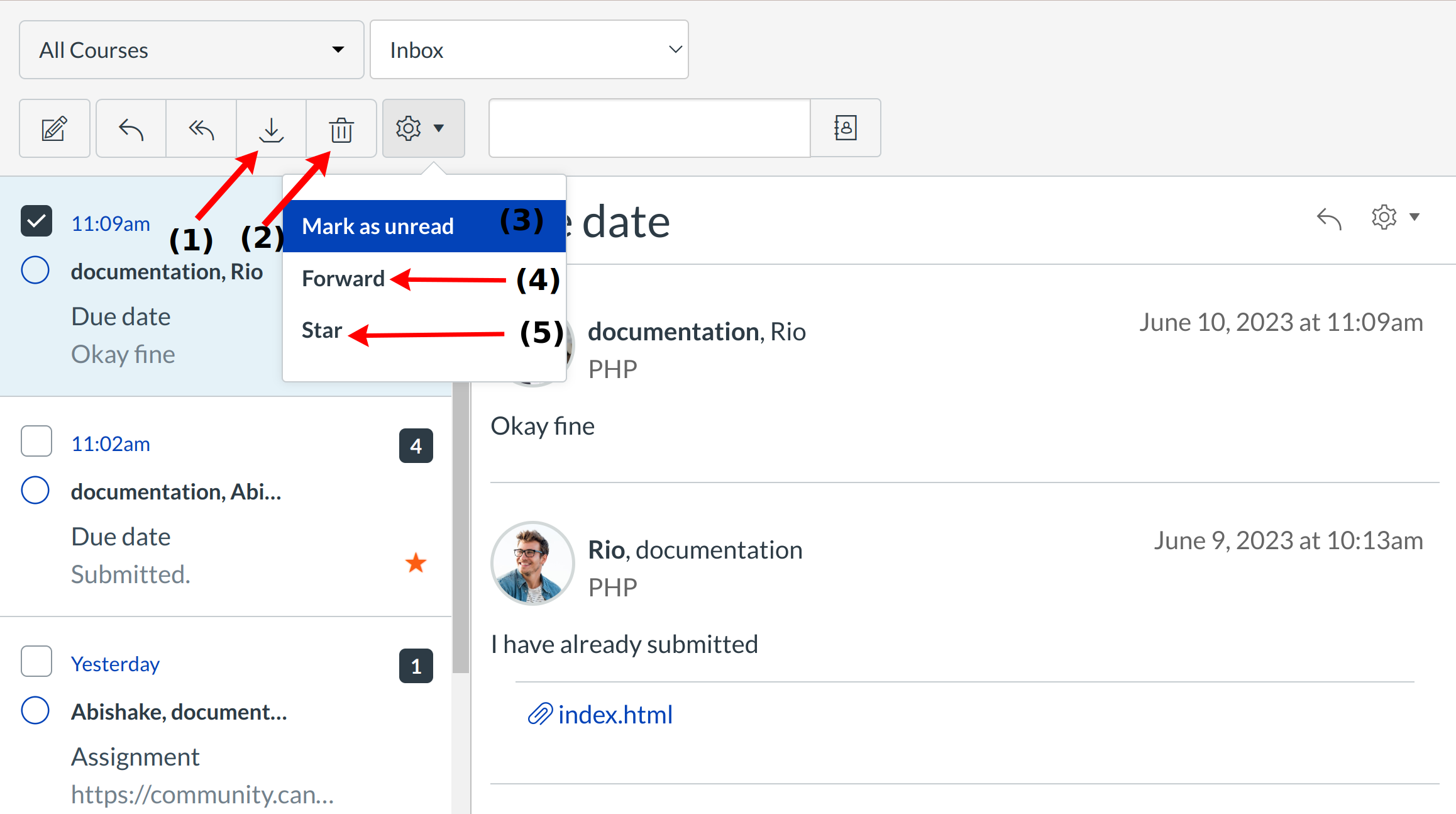 By clicking the Inbox drop-down menu, the window can show the Inbox, Unread Conversations, Starred Conversations, Sent Conversations, Archived Conversations and Submission Comments.