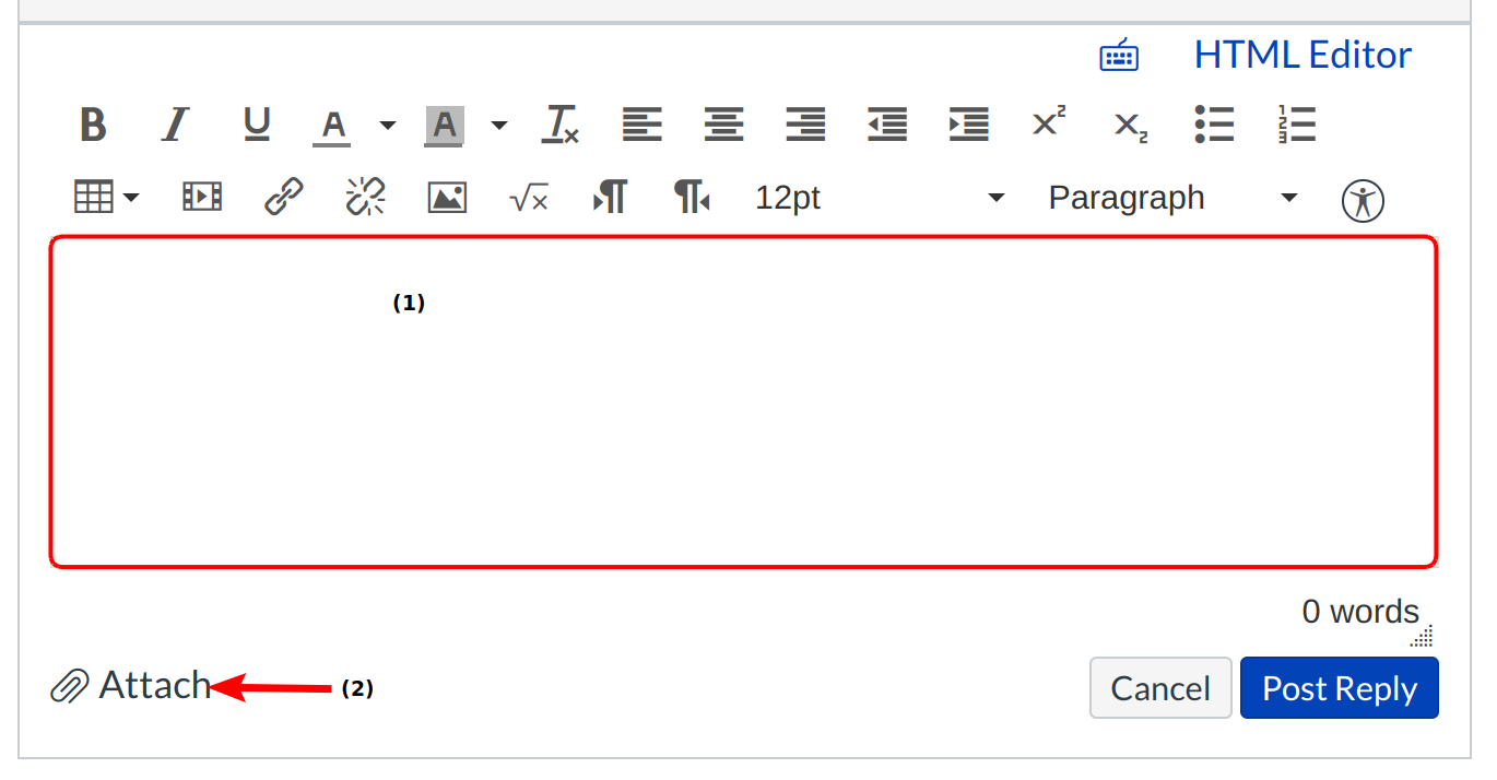 After adding content using the Rich Content Editor to the discussion reply [1], click the Attach button [2].
