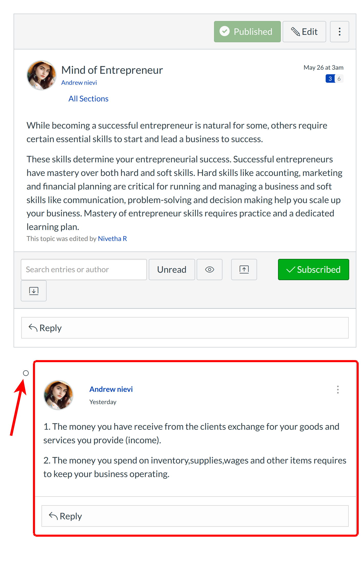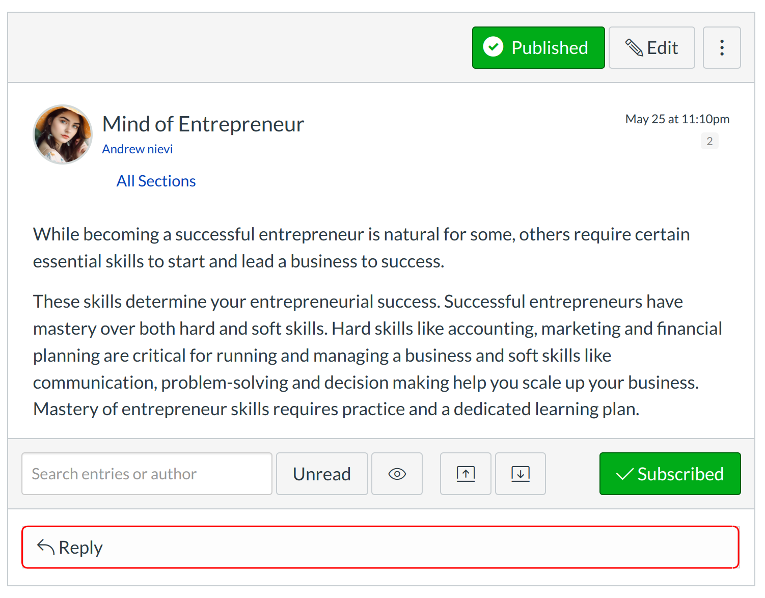Your reply will be posted at the bottom of the discussion reply thread. The border of your post will flash blue indicating it has been newly posted. The dot indicator next to your post will immediately turn white if Sublime LMS ™ automatically marks your posts as read. However, if you manually mark your posts as read, the indicator will remain blue.