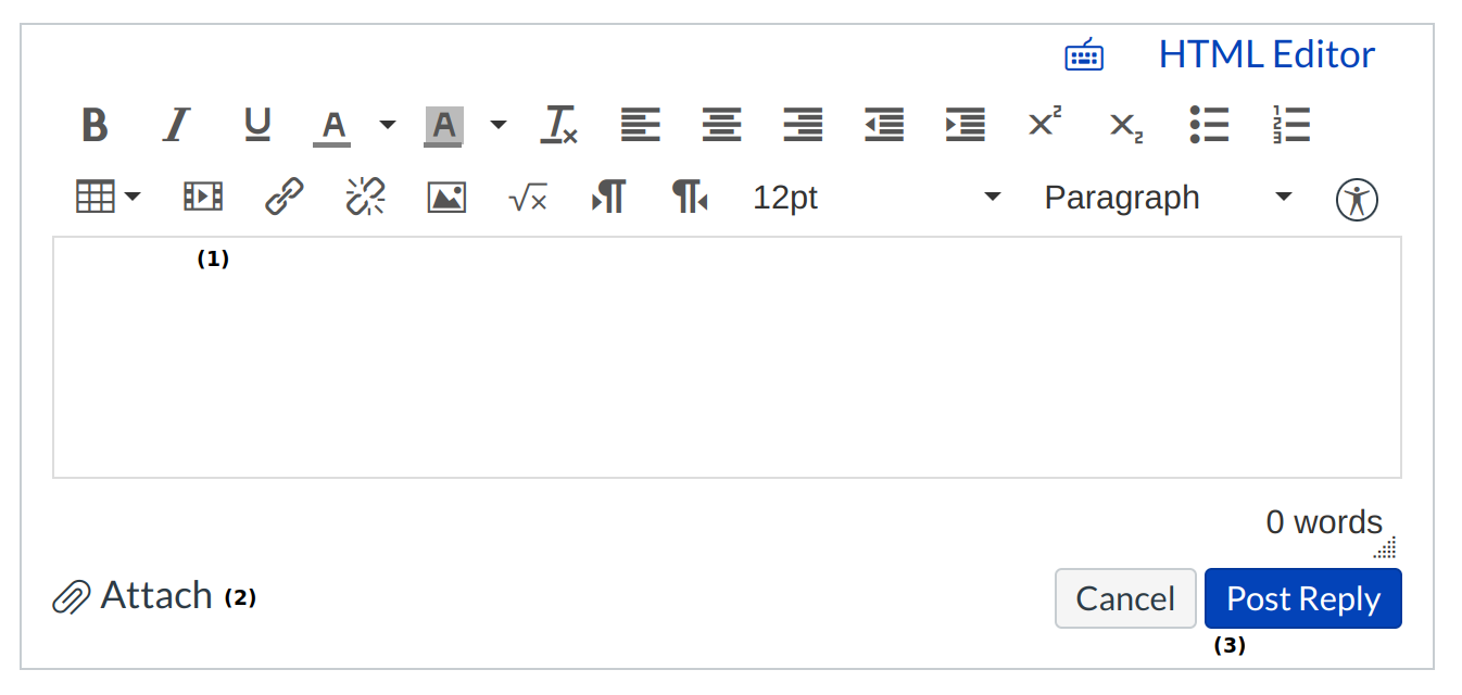 Write your response in the Rich Content Editor [1]. You can add links, photos, equations, and/or media. If your instructor allows, you can also attach files [2]. Once you finish, click the Post Reply button [3].