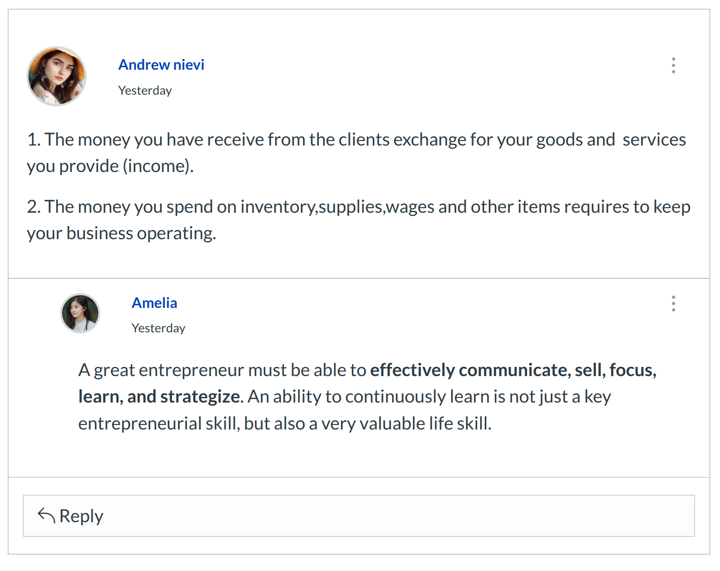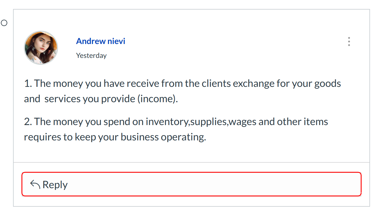 In a focused discussion, you can reply to a comment already posted by another student by clicking in the reply field below the post.