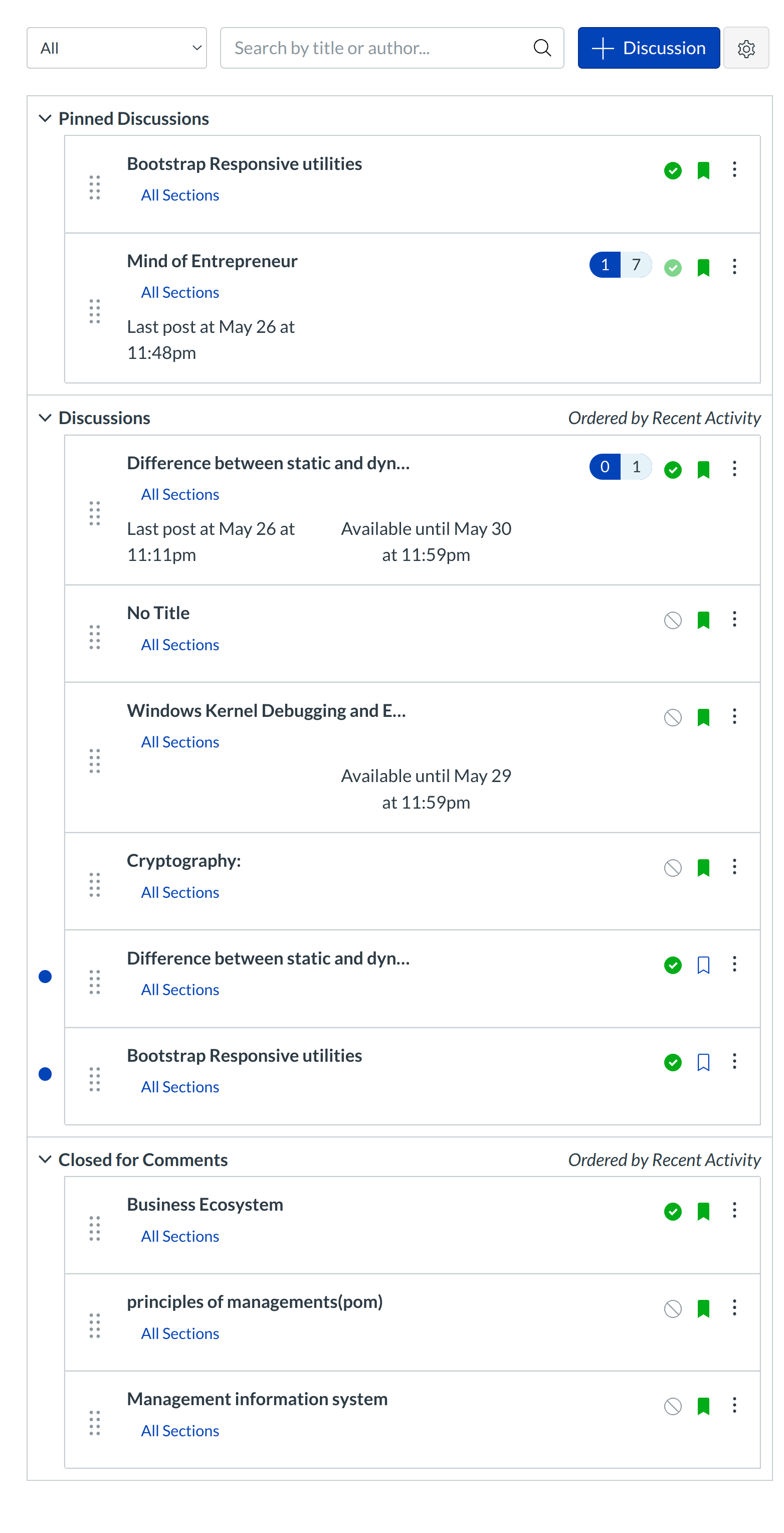 Pinned Discussions. These are discussions that your instructor wants you to pay specific attention to and will appear at the top of the Discussions page. You will only see this section heading if there are discussions within this section.