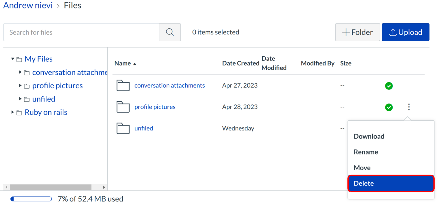 Note: The Unfiled Folder stores documents, graphics, and any other files from your account that you have posted to different areas of Sublime LMS ™, such as Discussions. Deleting these items within current courses may create broken links and submissions. However, if you delete a file that you submitted as an Assignment, it will not delete your assignment submission in the course.