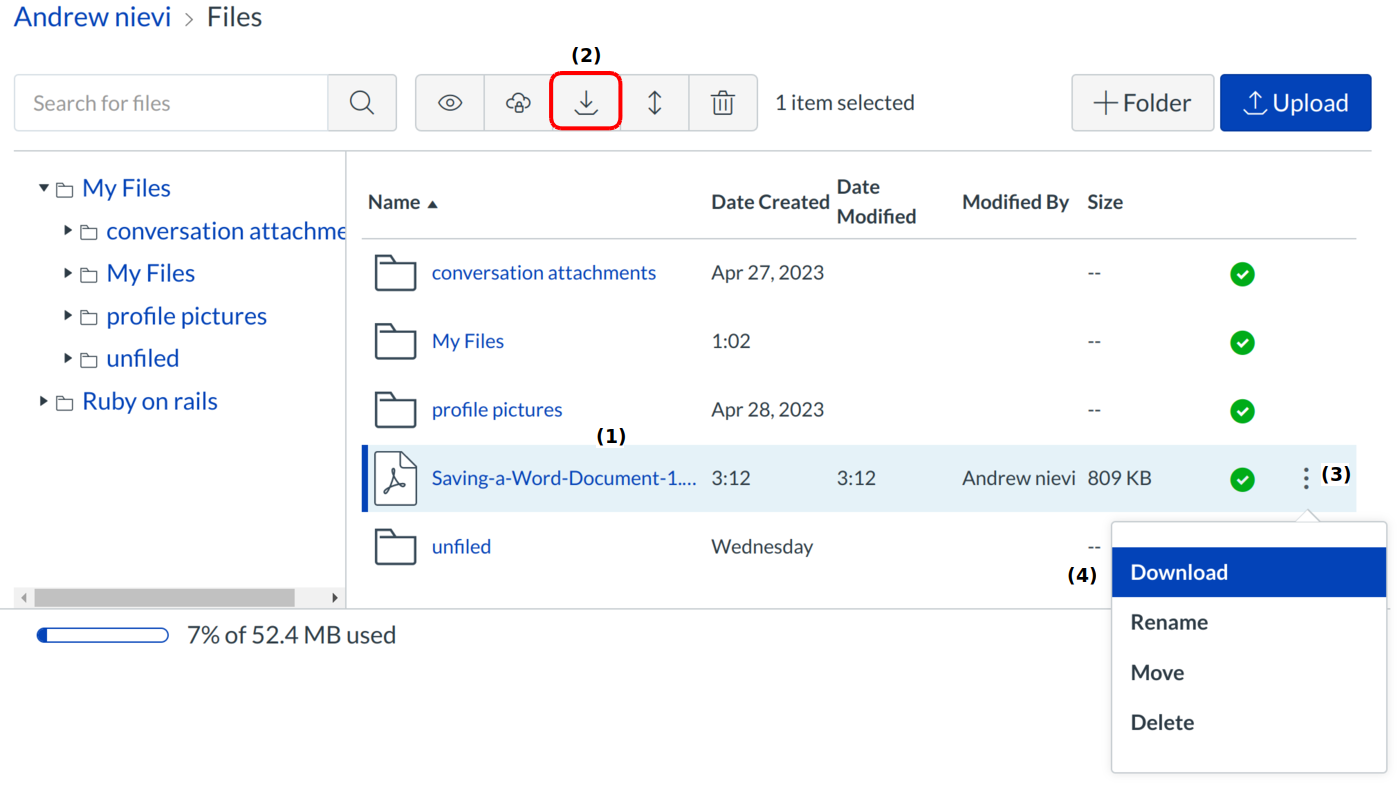 You can download a folder in a .zip format in your personal, group, or course files. This lesson will show you how to download a folder from a course.