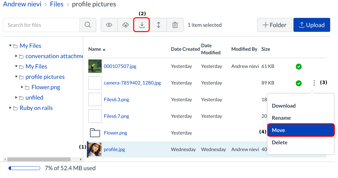In user or group files, locate the file you want to move. Click the line item for the file [1]. To move the file via the toolbar, click the Move button [2]. To move the file via file settings, click the Options icon [3], then click the Move link [4].