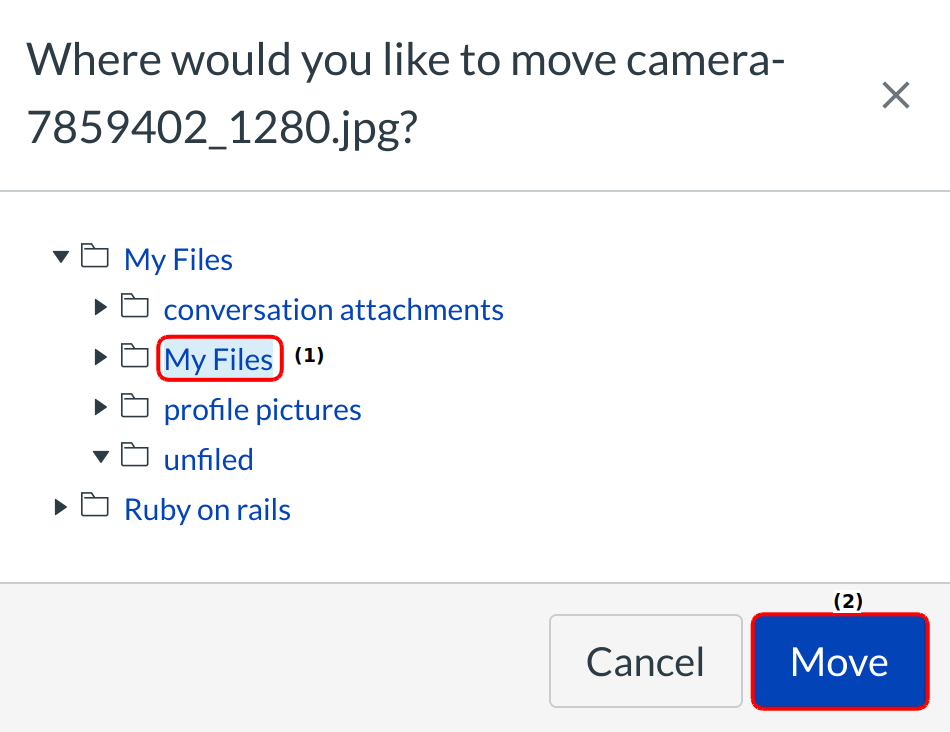 Select the folder where you want to move the file [1] and click the Move button [2]..