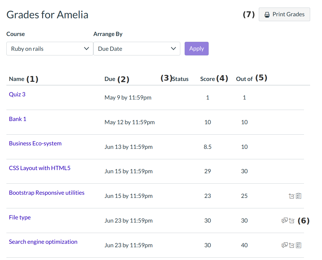 You can view the name of the assignment [1], the assignment due date [2], the assignment status [3],the score you earned [4], the total point value of the assignment [5], and icons for any assignment details [6].