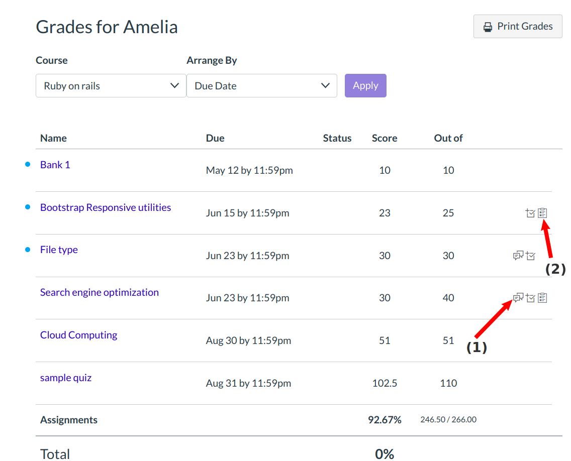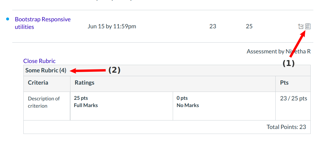 If there are comments on the assignment, a Speech Bubble icon [1] will appear next to the check mark. There could also be a Rubric icon [2] indicating the assignment has a rubric attached to it.
