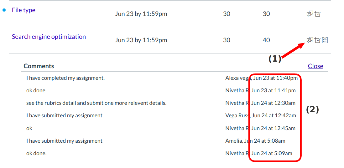 If there are comments on the assignment, click the Speech Bubble icon to view comments [1]. Comments will be organized chronologically [2]. To close comments, again click the Bubble icon .