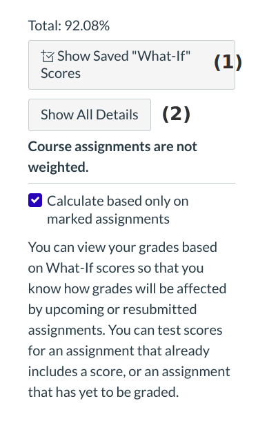 The grade summary allows you to show and revert any saved what-if scores [1], and show/hide all Scoring Details [2].