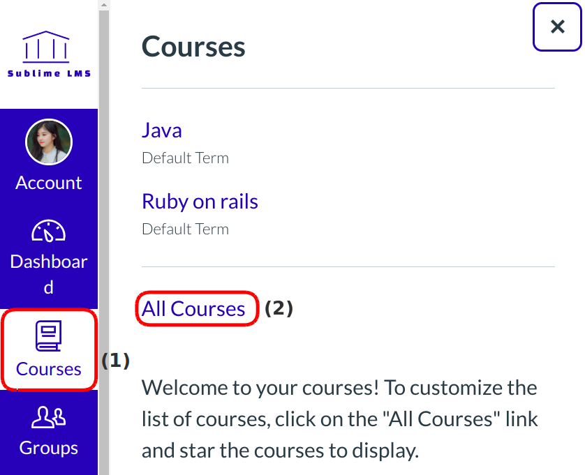 In Global Navigation, click the Courses [1]. Click the All Courses link [2].