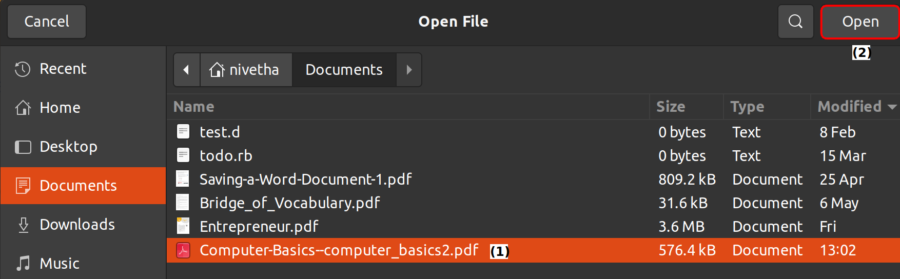 Click the document you want to upload [1] and click the Open button [2].