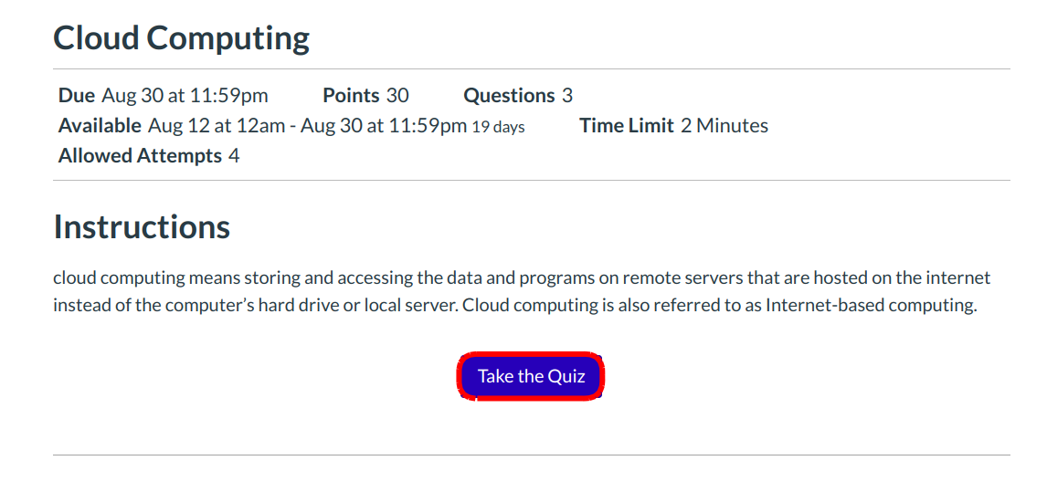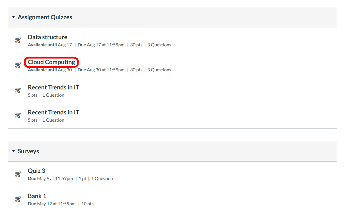 Here you'll see a list of quizzes for the course. For each of these quizzes you'll see a due date (if there is one) as well as the point value and some other details about it.