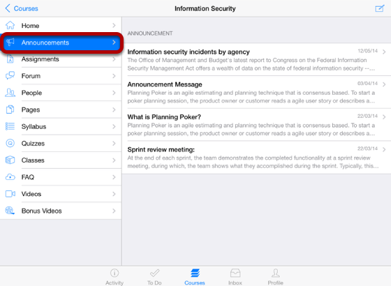 All the Announcements in your course appear on the left side of the application and you can view the announcement details on the right side by selecting a particular announcement title.