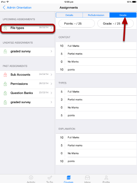 To view the Assignment Rubric Information, tap the Grades tab [ 1 ]. This information is also set by the instructor.