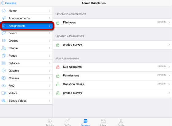 All the Assignments in your course appear on the left side of the application. You can view the Assignment details on the right side by selecting a particular Assignment title.