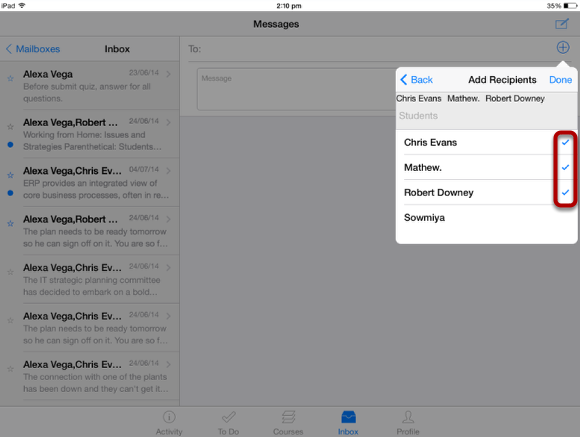 A tick mark is used to identify the selected recipient(s) name.