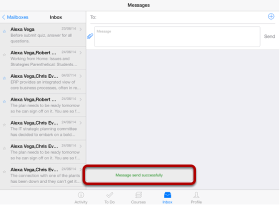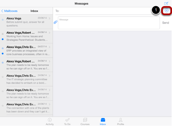 The compose message icon creates a new window by deleting the details in the view and To list. You can filter recipients by course and send messages to any individuals and multiple recipients.