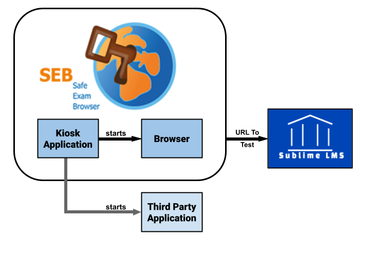 The illustration below shows two internal components which the Safe Exam Browser consists of - the Kiosk Application and the Browser Part. The third part of a Safe Exam Browser Exam Environment is built into the supported LMS. Optionally one or several third party application(s) can be allowed to run during an exam. These applications are started by the Safe Exam Browser Kiosk Application.